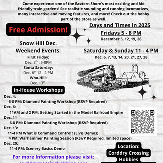 Located just 1 block away from the LSLT office (110 W Green St Unit A, Snow Hill, MD 21863). There will be open houses and workshops all December long. For more information, please call 410-710-8038 or visit corddrycrossinghobbies.com.